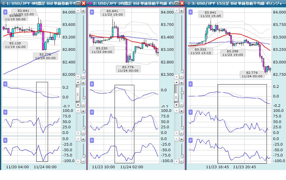 上記のように、テクニカルチャートの4時間足、1時間足、15分足上に