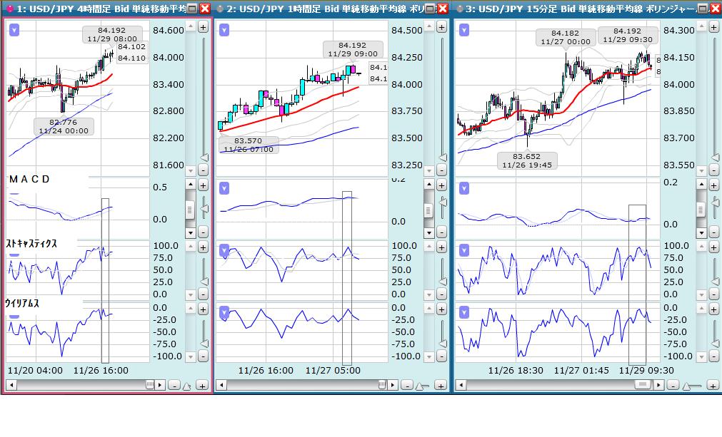 上記のように、テクニカルチャートの4時間足、1時間足、15分足上に